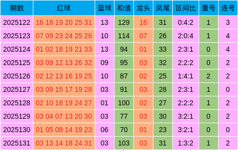 当期红球号码大小比为3:3,三区比为1:3:2,奇偶比为3:3,龙头开出03,凤尾开出31,开出1枚重号14,开出1组连号13,14。蓝球开出奇数号码03。