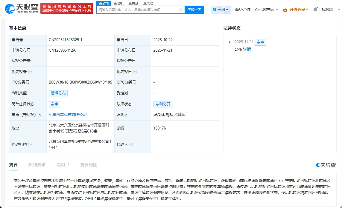 【CNMO科技消息】11月21日,据天眼查公开信息显示正规配资平台推荐,小米汽车科技有限公司一项名为“车辆漂移方法、装置、车辆、存储介质及程序产品”的发明专利正式公布。此举揭示了小米汽车在车辆动态控制与极限驾驶辅助领域的前沿布局,旨在通过技术创新提升高性能驾驶的安全性与稳定性。