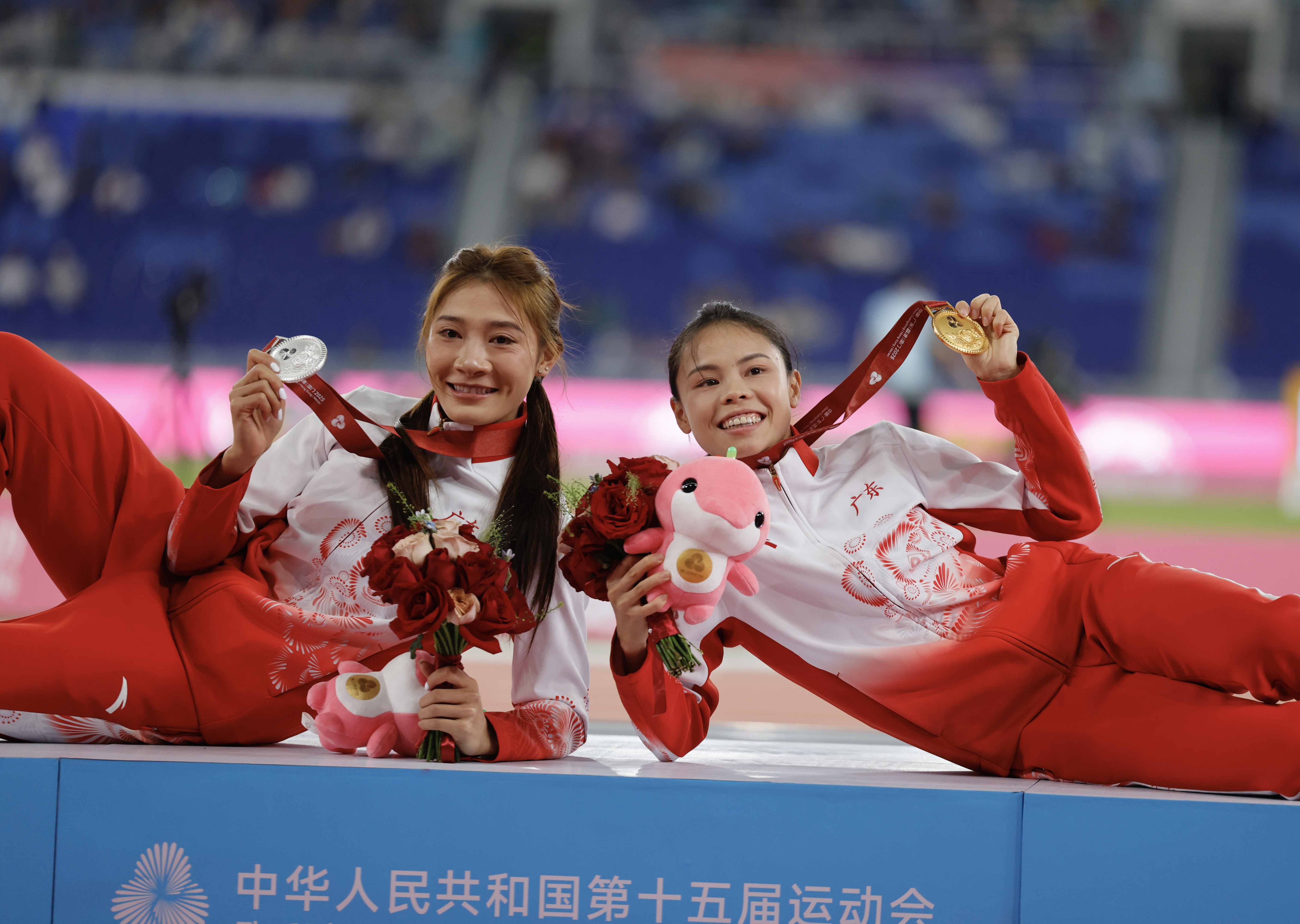 莫家蝶(右)与孔莹蓥(左)包揽女子400米栏冠亚军。 南方+ 张由琼 拍摄