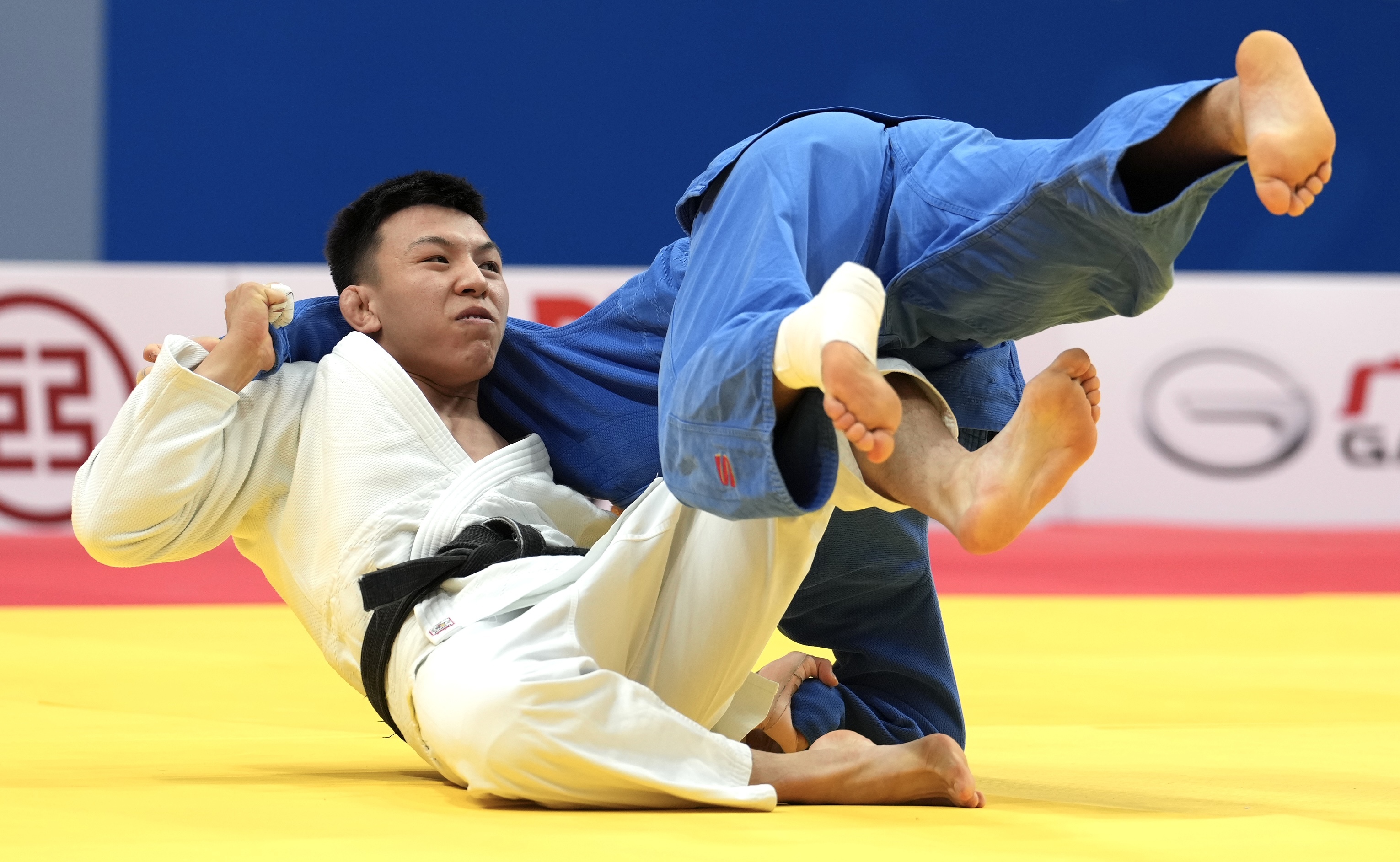 广东选手优秀(白)在赛场击败对手。 南方+ 卢逸轩 拍摄