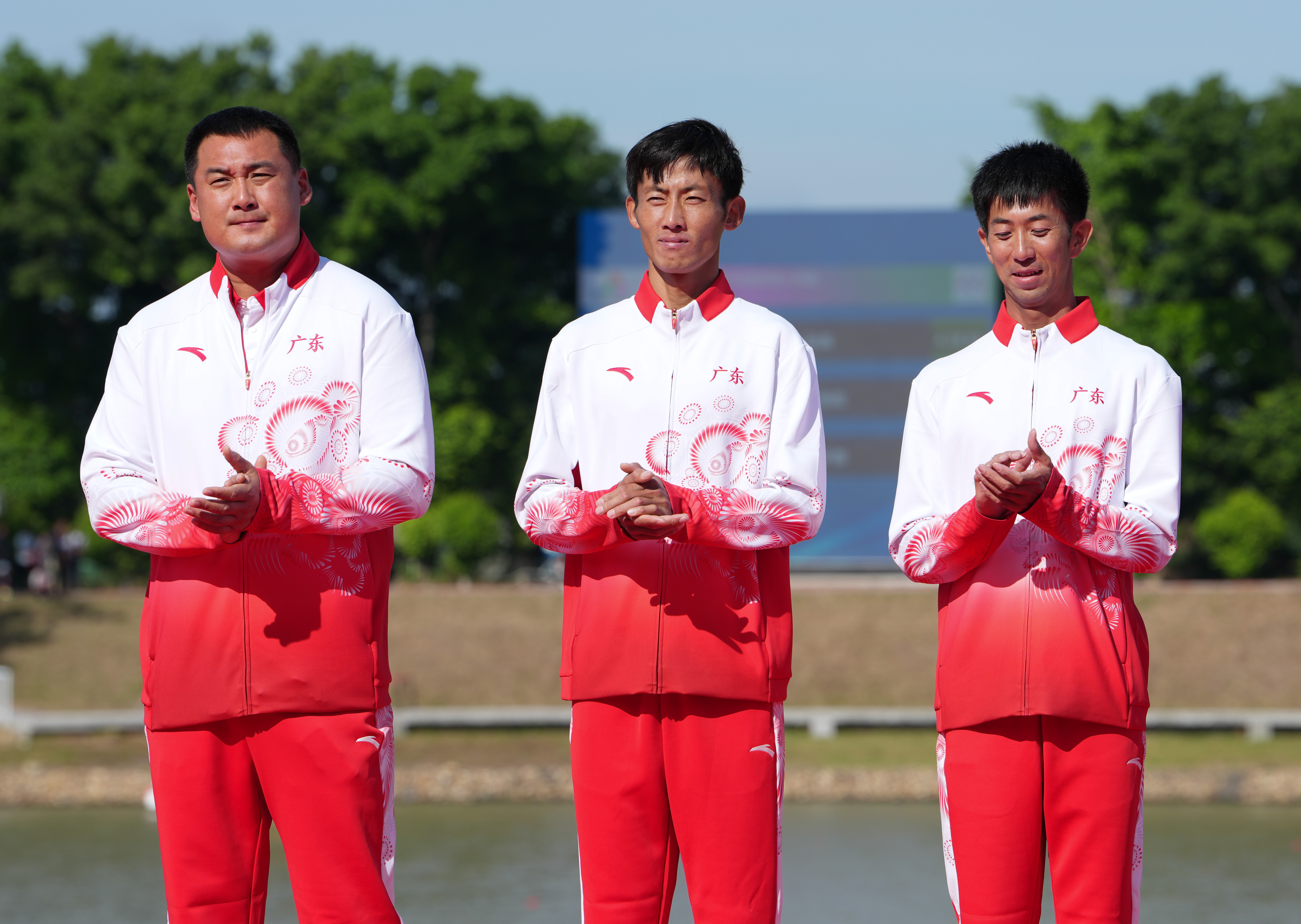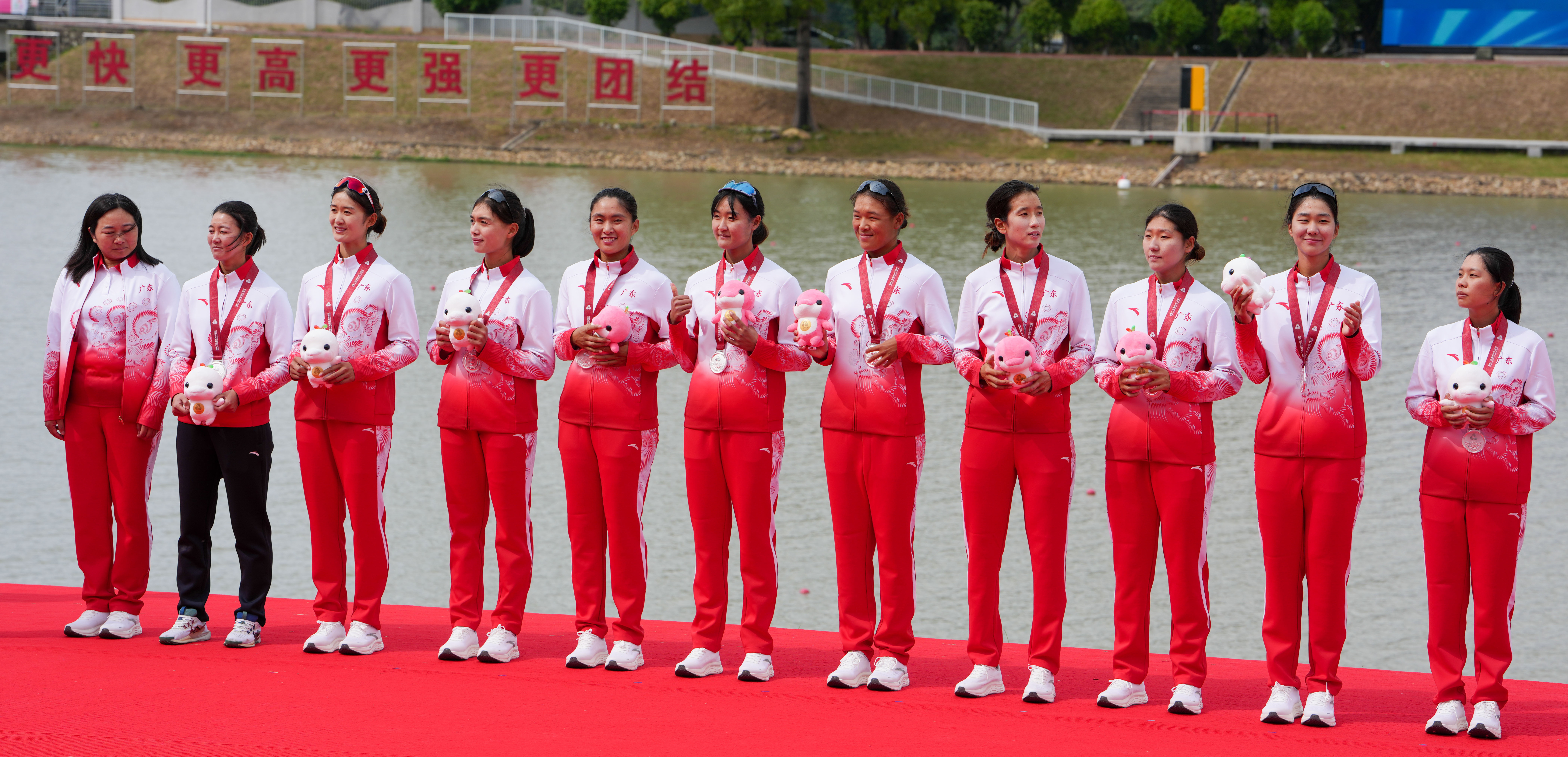 赛艇广东队选手和教练员在颁奖仪式上合影。 十五运会信息发布平台 供图