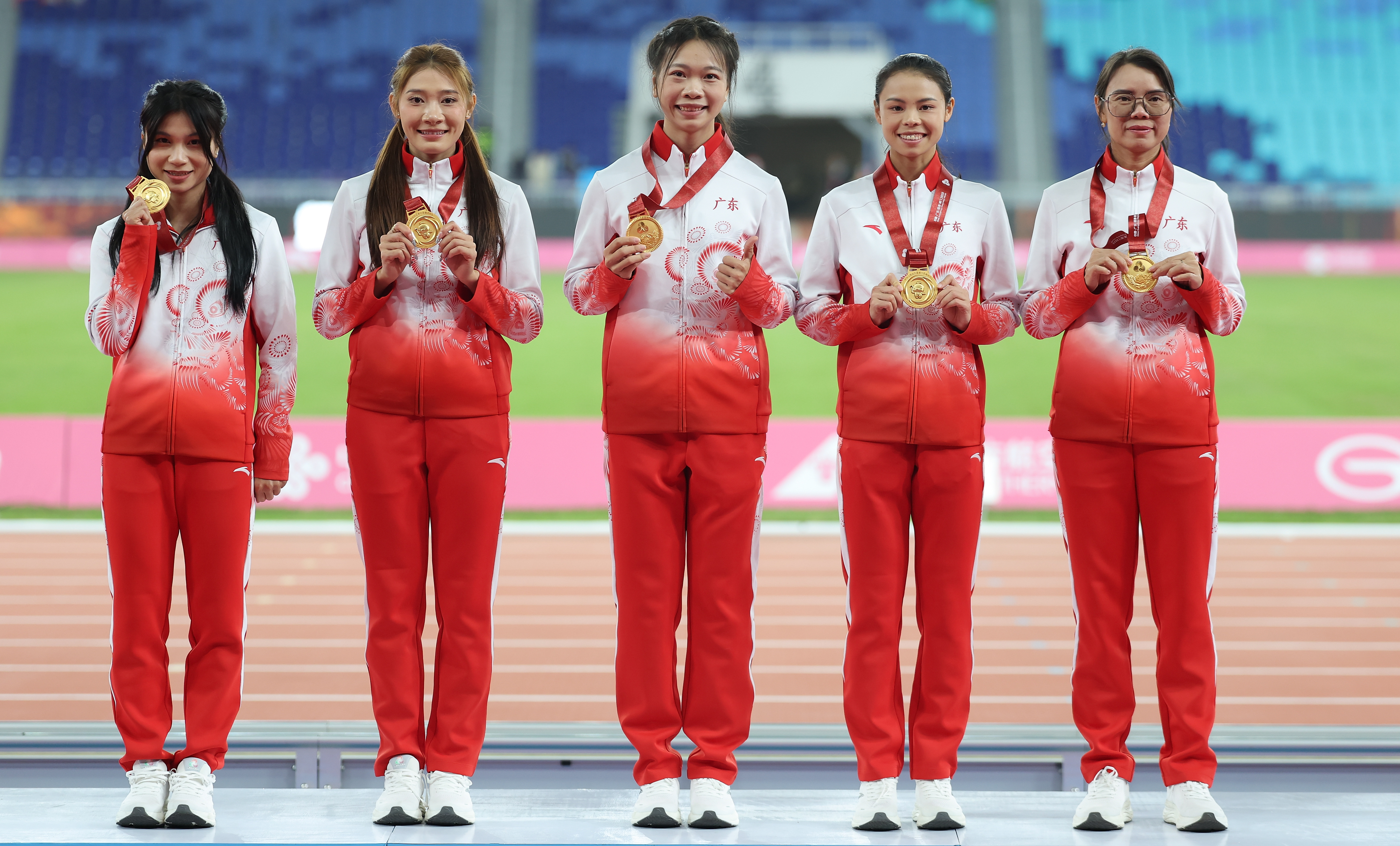 广东队夺得女子4x400米接力冠军,严海玲(左一)、孔莹蓥(左二)、莫家蝶(右二)均为肇庆运动员。 十五运会信息发布平台 供图