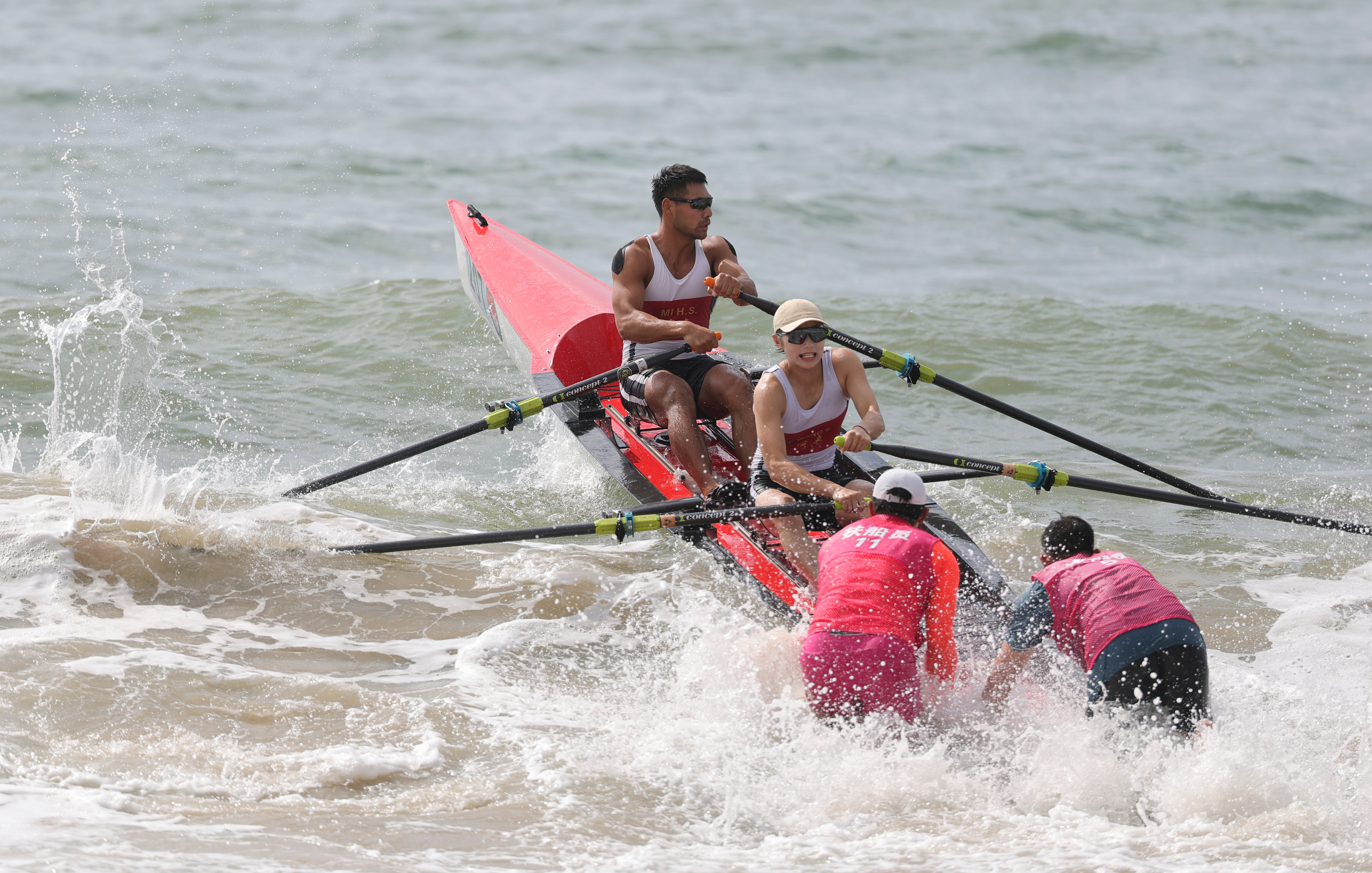 广东队组合米浩帅(左一)/王森(左二)在海岸赛艇决赛B中战胜辽宁队组合孙满/王思璇,获得铜牌。 十五运会信息发布平台 供图